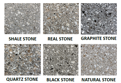 Comparison of different types of stones: shale, real, graphite, quartz, black, and natural stones.